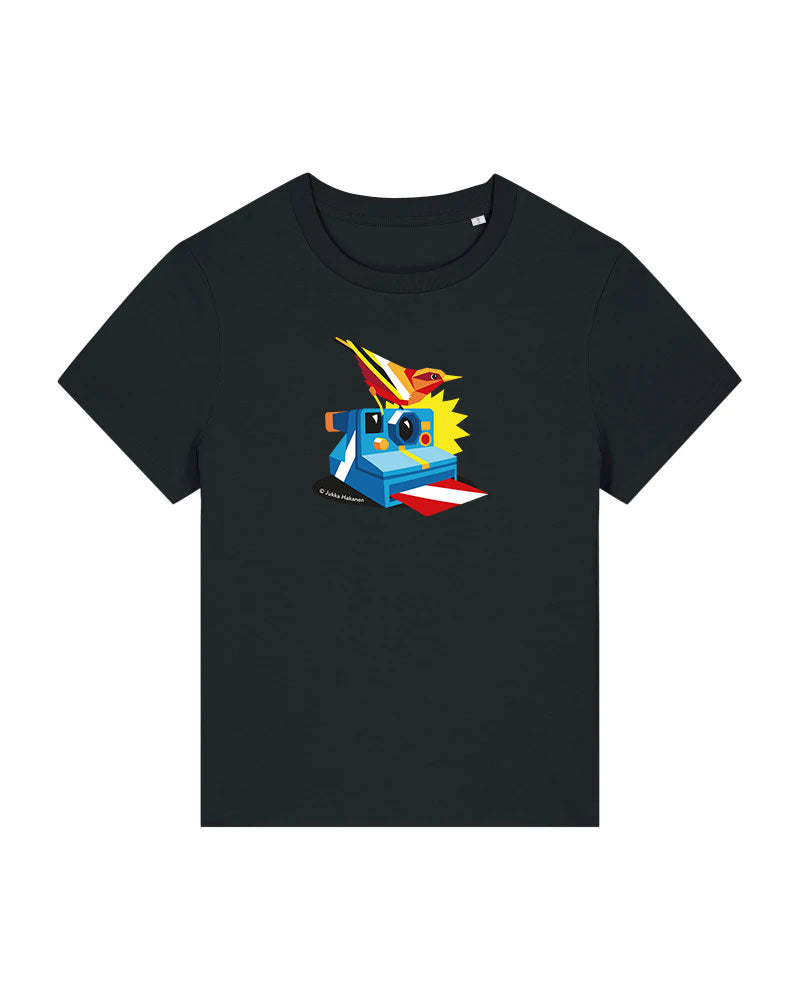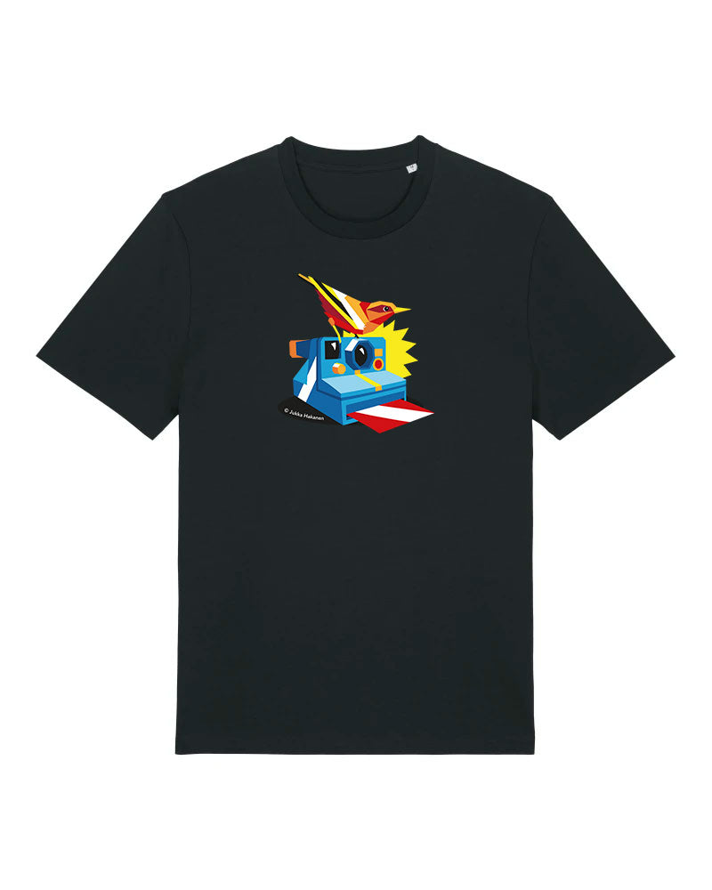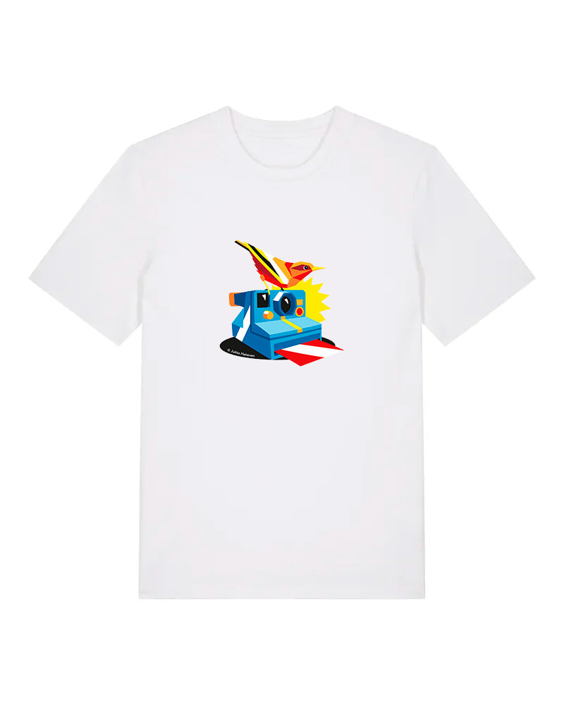Laadukas 100% luomupuuvilainen t-paita jossa painatus Jukka Hakasen taideteoksesta Foto. Saatavilla sekä unisex että naistenmalli. Istuvuus Medium fit. Värit valkoinen ja musta.