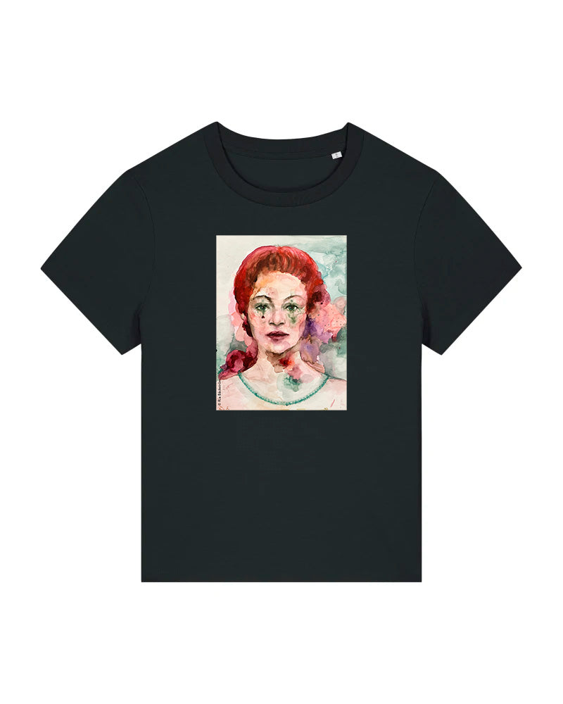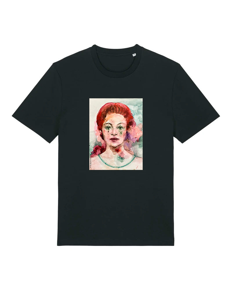 Laadukas 100% luomupuuvillainen t-paita jossa painatus Ria Bäckströmin akvarellityöstä Herttakuningatar. Saatavilla sekä unisex että naistenmalli. Istuvuus Medium fit. Värit valkoinen ja musta.