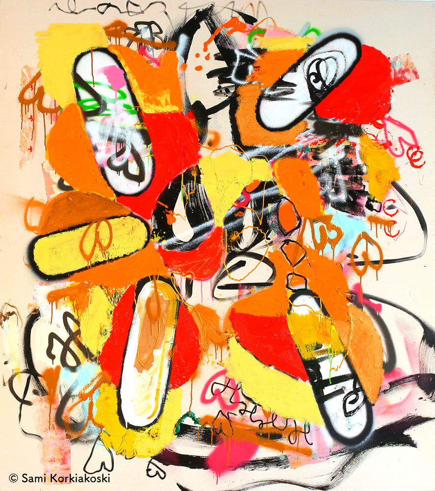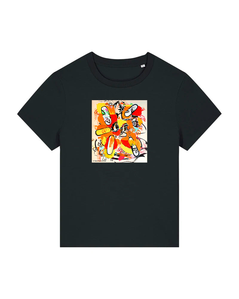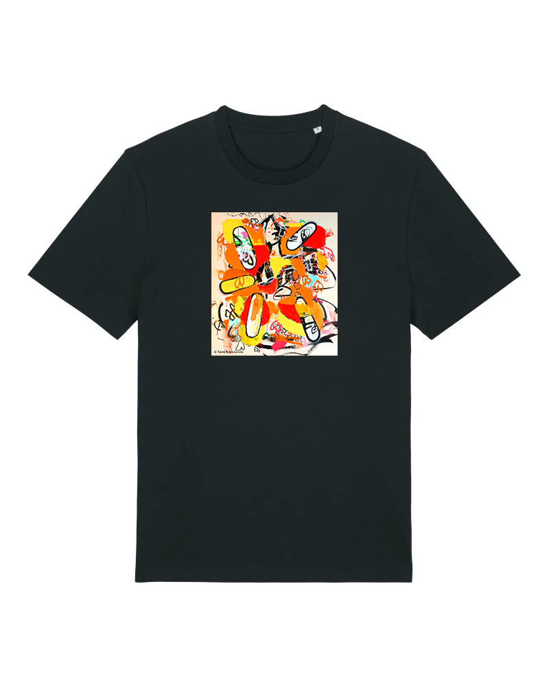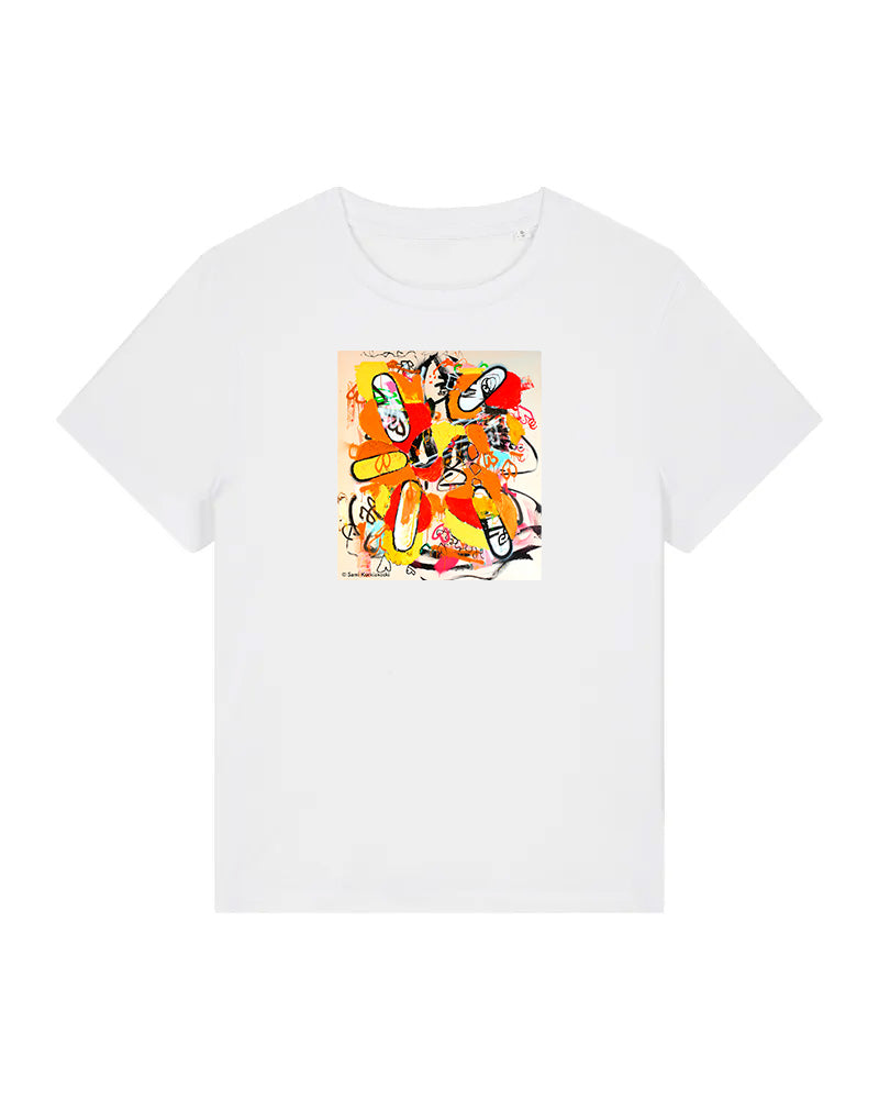 Laadukas 100% luomupuuvillainen t-paita jossa painatus Sami Korkiakosken taideteoksesta Hurmio. Saatavilla sekä unisex että naistenmalli. Istuvuus Medium fit. Värit valkoinen ja musta.