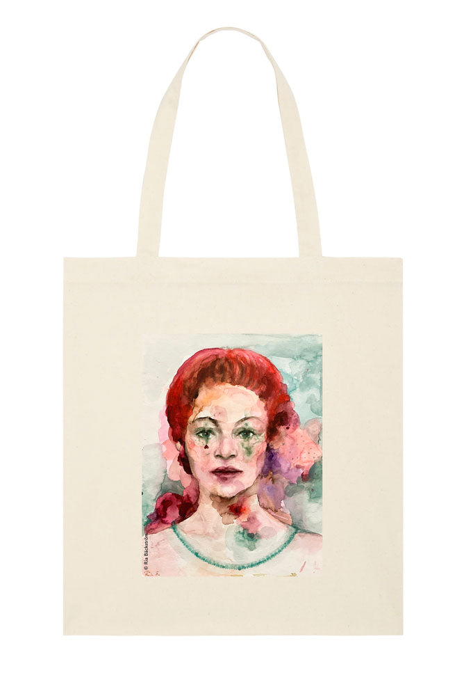 Luonnonvaalea luomupuuvillainen kangaskassi pitkillä kahvoilla. Kassissa painatus Ria Bäckströmin taideteoksesta Herttakuningatar.