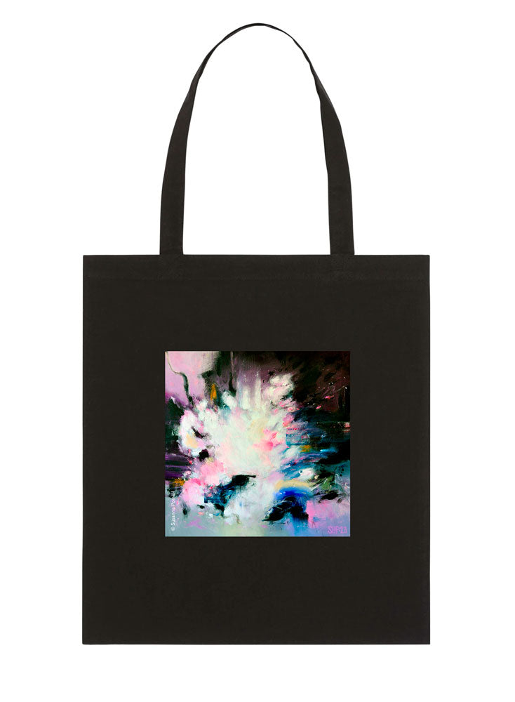 Musta luomupuuvillainen kangaskassi pitkillä kahvoilla. Kassissa painatus Susanna Poméllin taideteoksesta The universe needs you here .