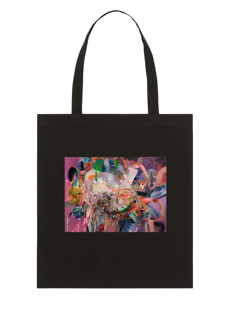 Musta luomupuuvillainen kangaskassi pitkillä kahvoilla. Kassissa painatus Jani Rättyän taideteoksesta Herkuttelu.