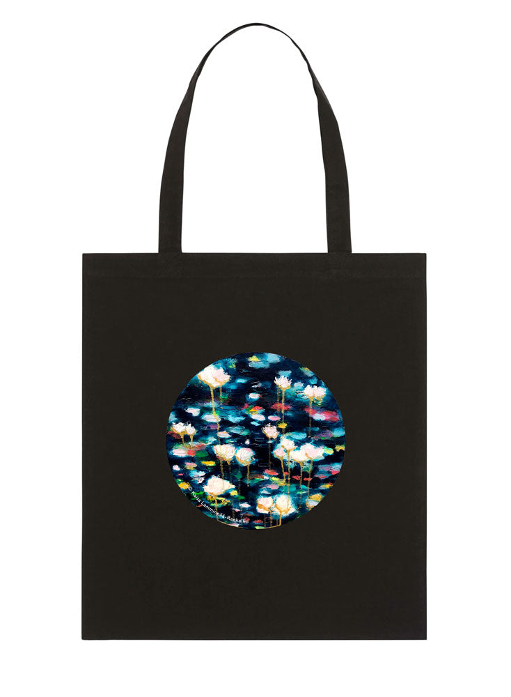 Musta luomupuuvillainen kangaskassi pitkillä kahvoilla. Kassissa painatus Kaisa Lamminpää-Raekallion taideteoksesta Hiljainen laulu.