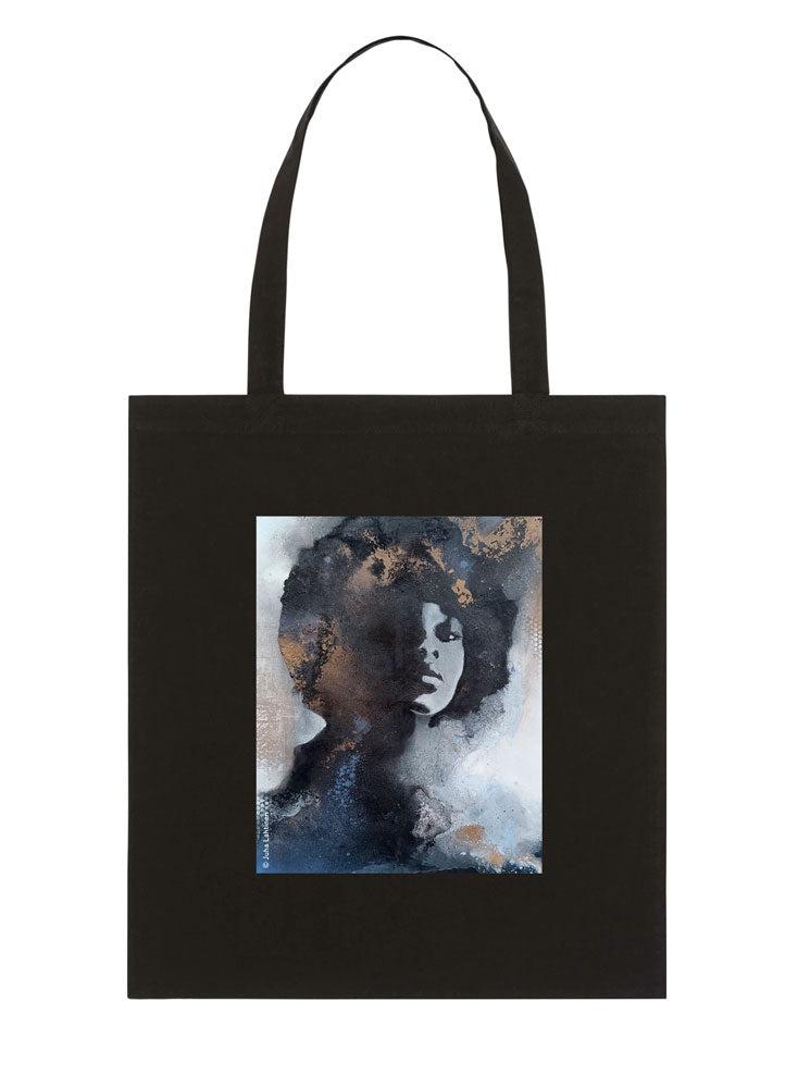 Musta luomupuuvillainen kangaskassi pitkillä kahvoilla. Kassissa painatus Juha Lahtisen taideteoksesta Cold game.
