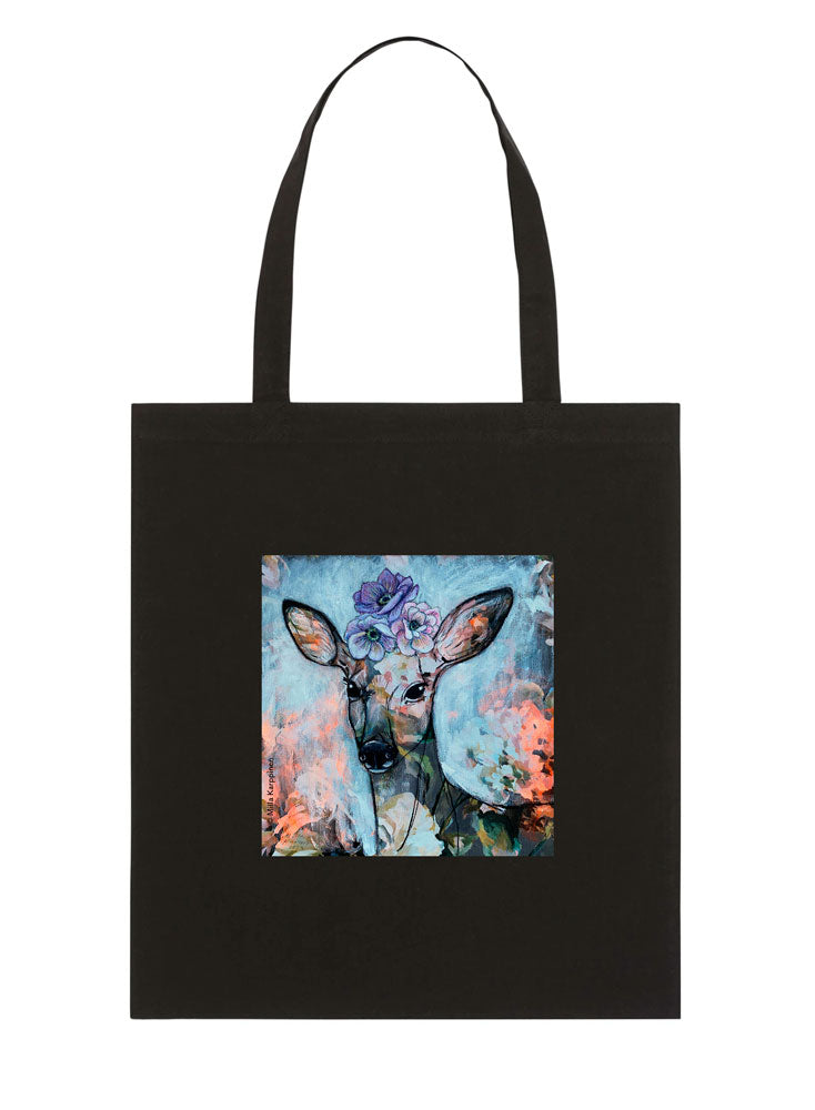 Musta luomupuuvillainen kangaskassi pitkillä kahvoilla. Kassissa painatus Milla Karppisen taideteoksesta Kaipauksen syvin olemus .