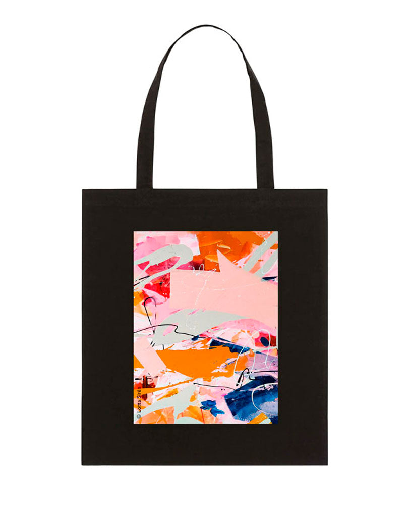 Musta luomupuuvillainen kangaskassi pitkillä kahvoilla. Kassissa painatus Lotta Sirénin taideteoksesta Worlds collide.