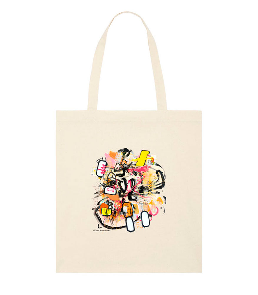 Luonnonvaalea luomupuuvillainen kangaskassi pitkillä kahvoilla. Kassissa painatus Sami Korkiakosken taideteoksesta Splash.