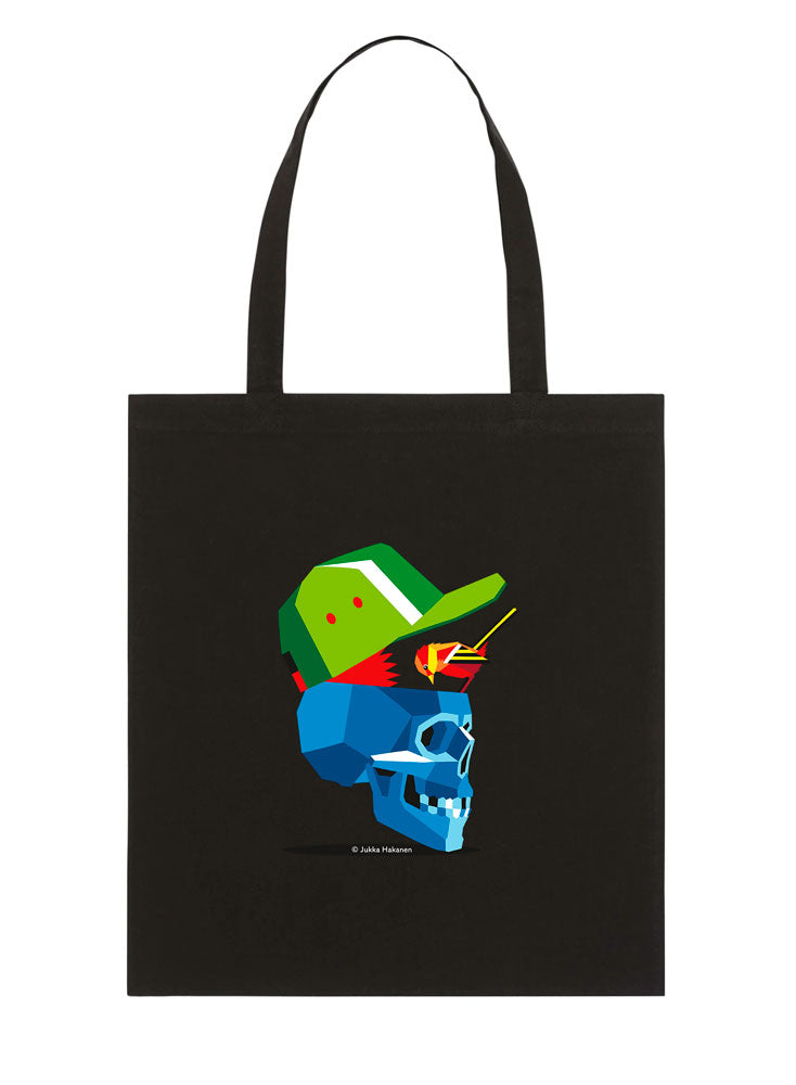 Musta luomupuuvillainen kangaskassi pitkillä kahvoilla. Kassissa painatus Jukka Hakasen taideteoksesta Kukkuu.