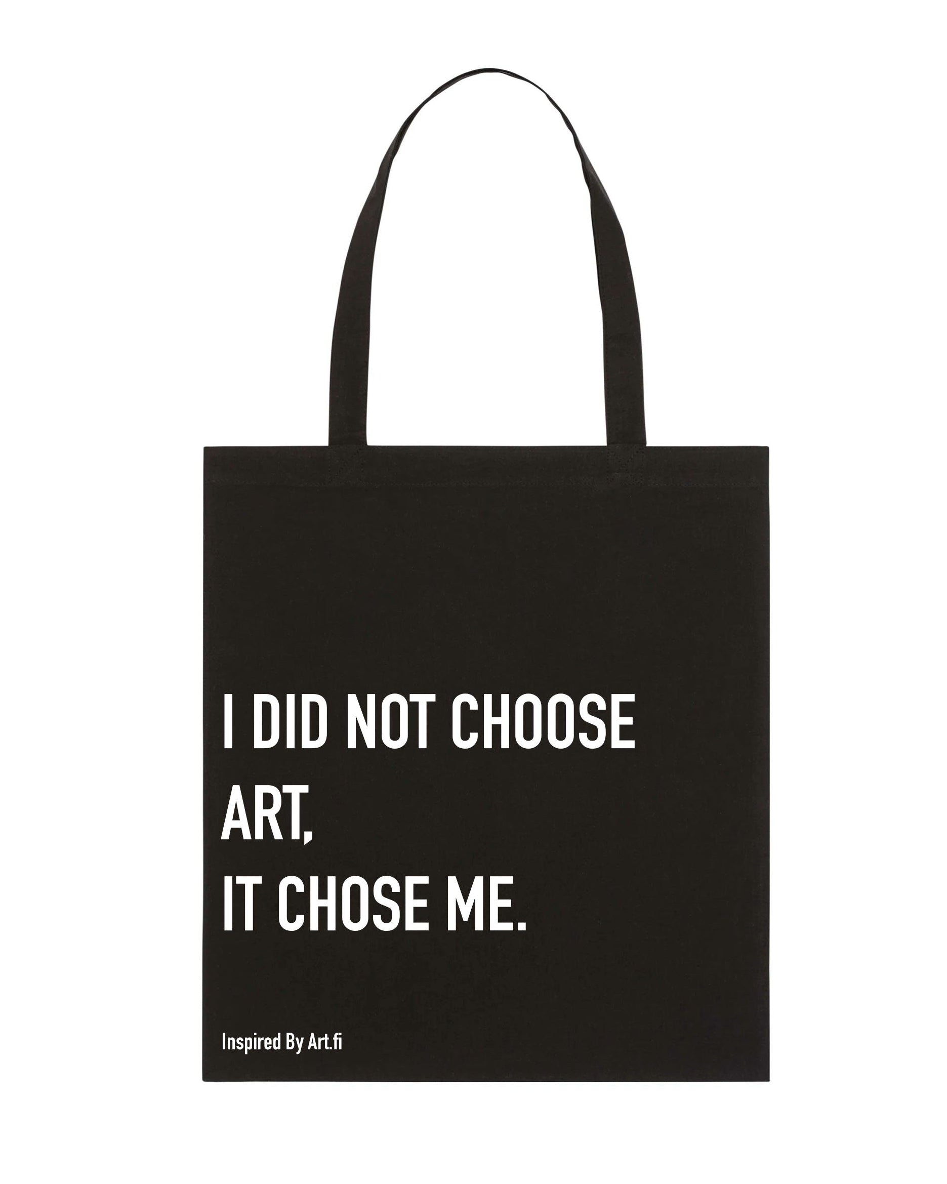 Musta luomupuuvillainen kangaskassi pitkillä kahvoilla. Kassissa teksti I did not choose art, It chose me.