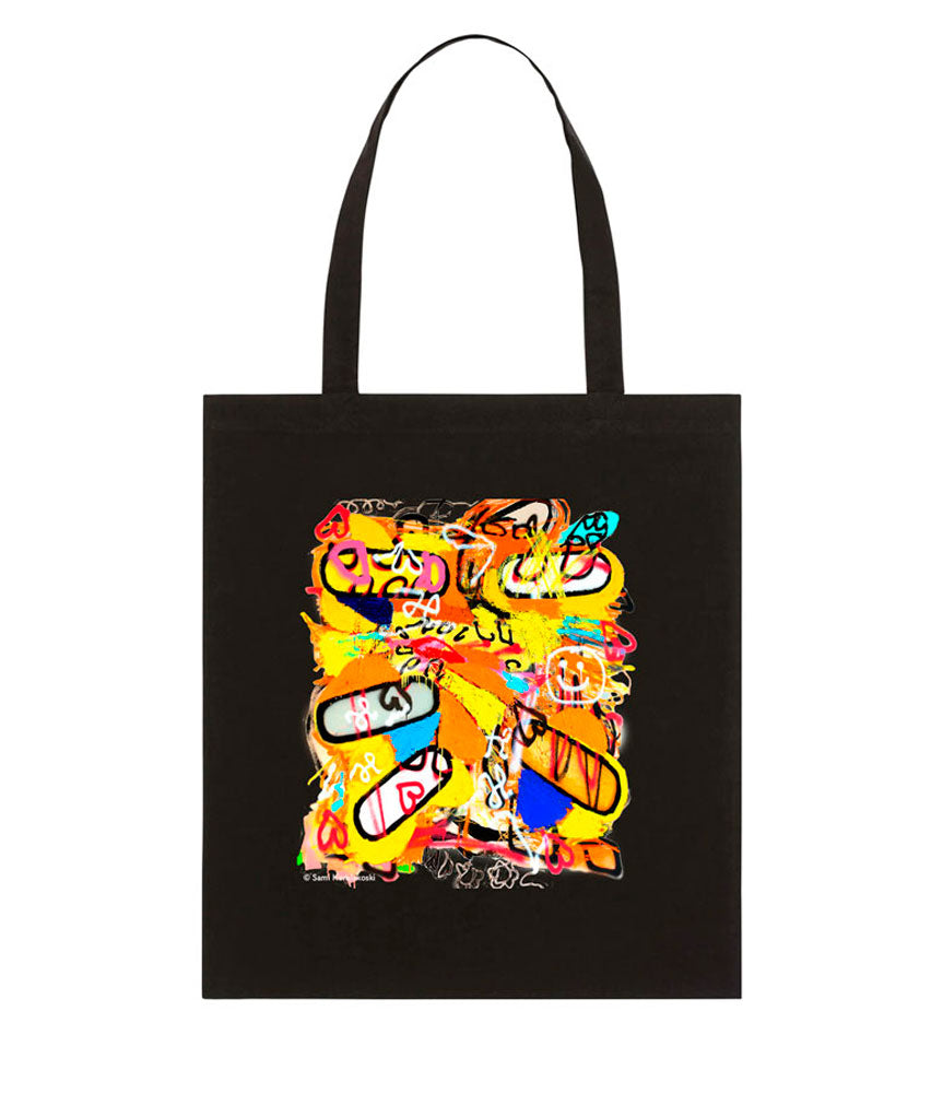 Musta luomupuuvillainen kangaskassi pitkillä kahvoilla. Kassissa painatus Sami Korkiakosken taideteoksesta Smiley.