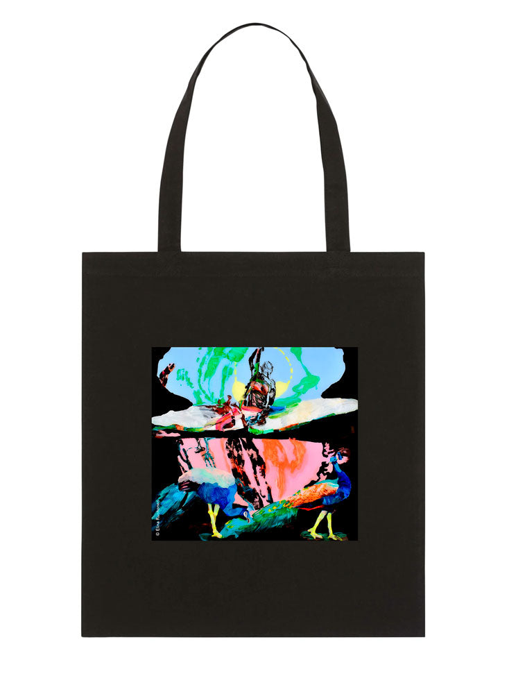 Musta luomupuuvillainen kangaskassi pitkillä kahvoilla. Kassissa painatus Elina Ruohosen taideteoksesta Absurdity, Glory and Drama.