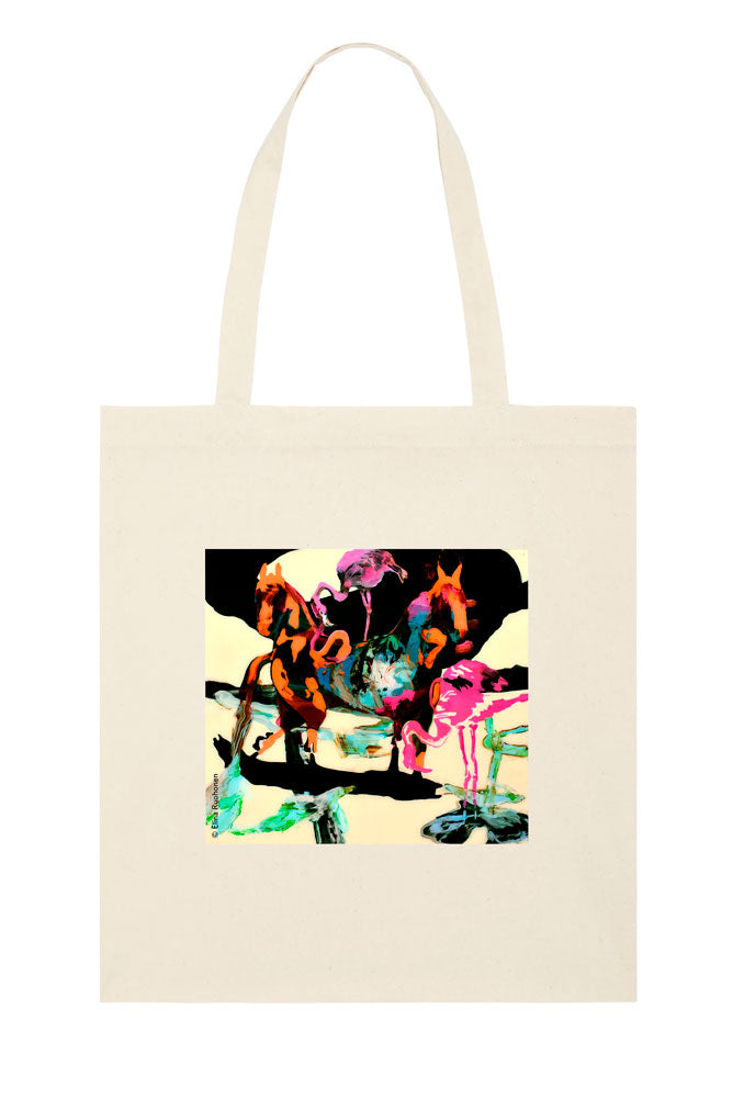 Luonnonvaalea luomupuuvillainen kangaskassi pitkillä kahvoilla. Kassissa painatus Elina Ruohosen taideteoksesta Suurpääomat.