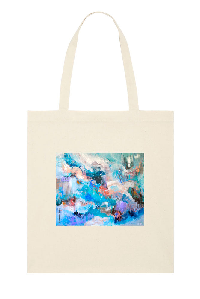 Luonnonvaalea luomupuuvillainen kangaskassi pitkillä kahvoilla. Kassissa painatus Susanna Poméllin taideteoksesta In love with my future.