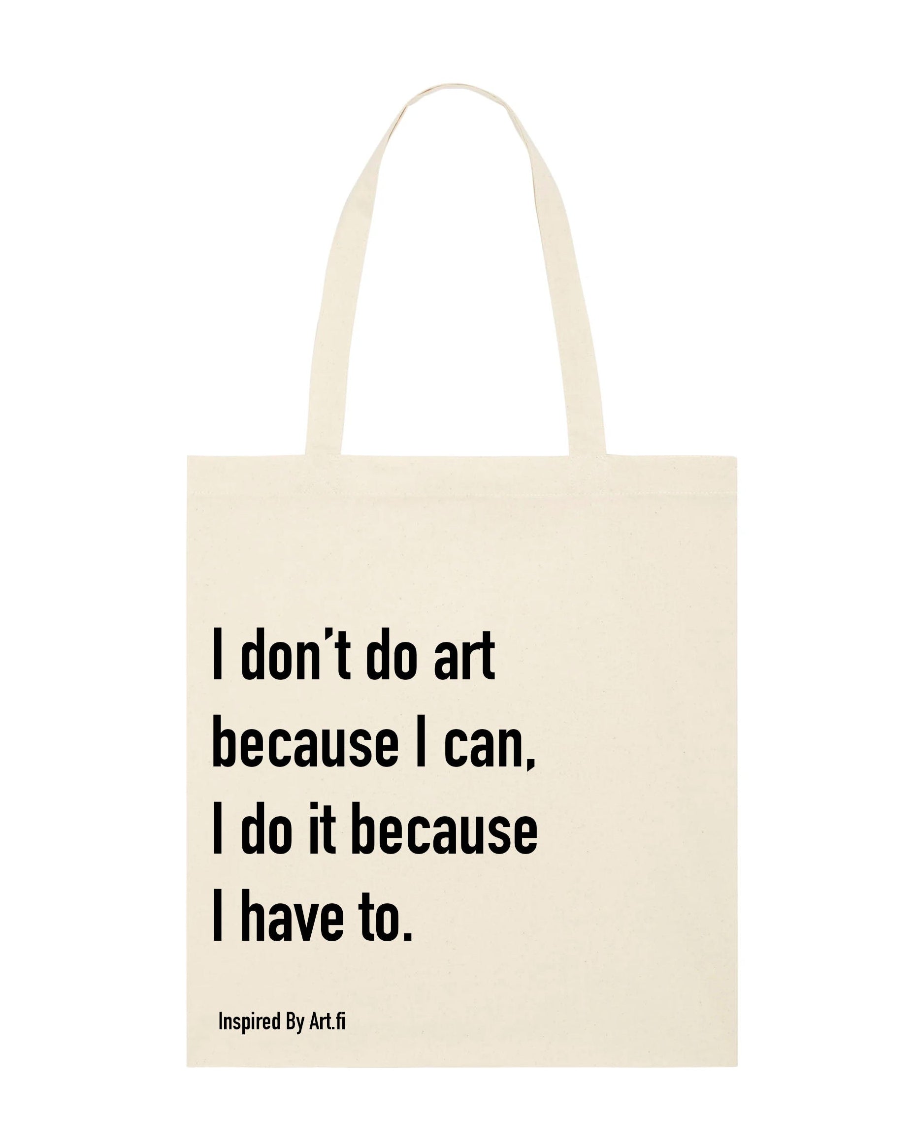 Luonnonvaalea luomupuuvillainen kangaskassi pitkillä kahvoilla. Kassissa teksti I did not choose art, It chose me.