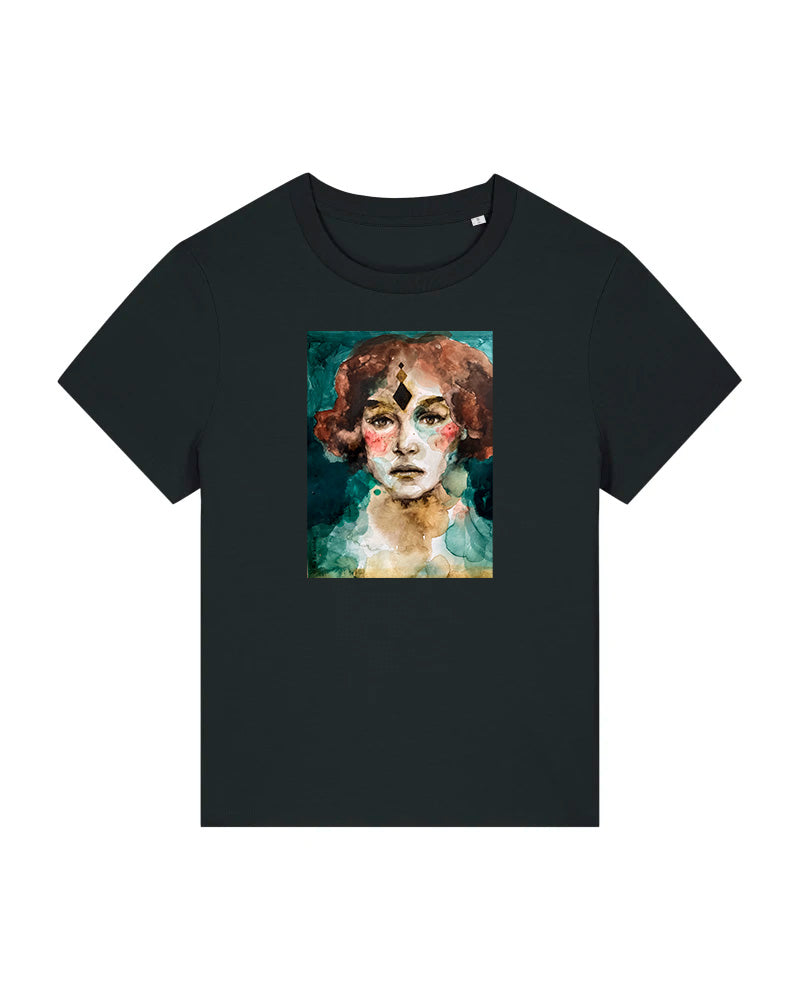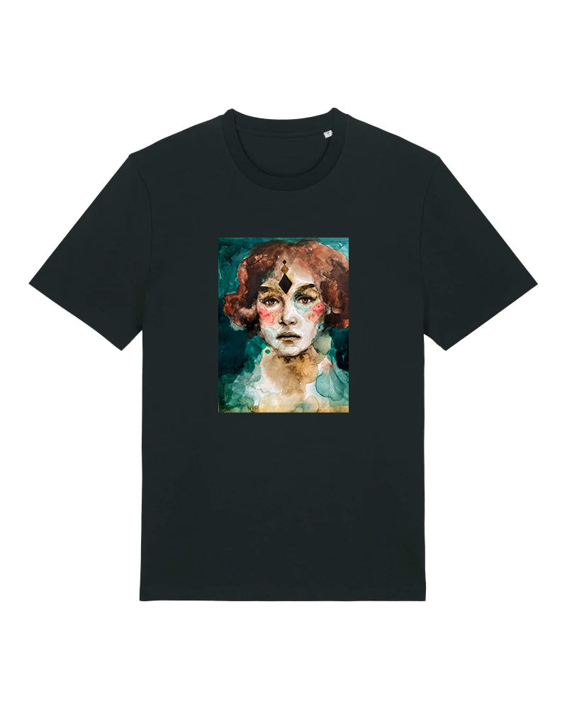 Laadukas 100% luomupuuvillainen t-paita jossa painatus Ria Bäckströmin taideteoksesta Ruutukuningatar. Saatavilla sekä unisex että naistenmalli. Istuvuus Mediun fit. Värit valkoinen ja musta.
